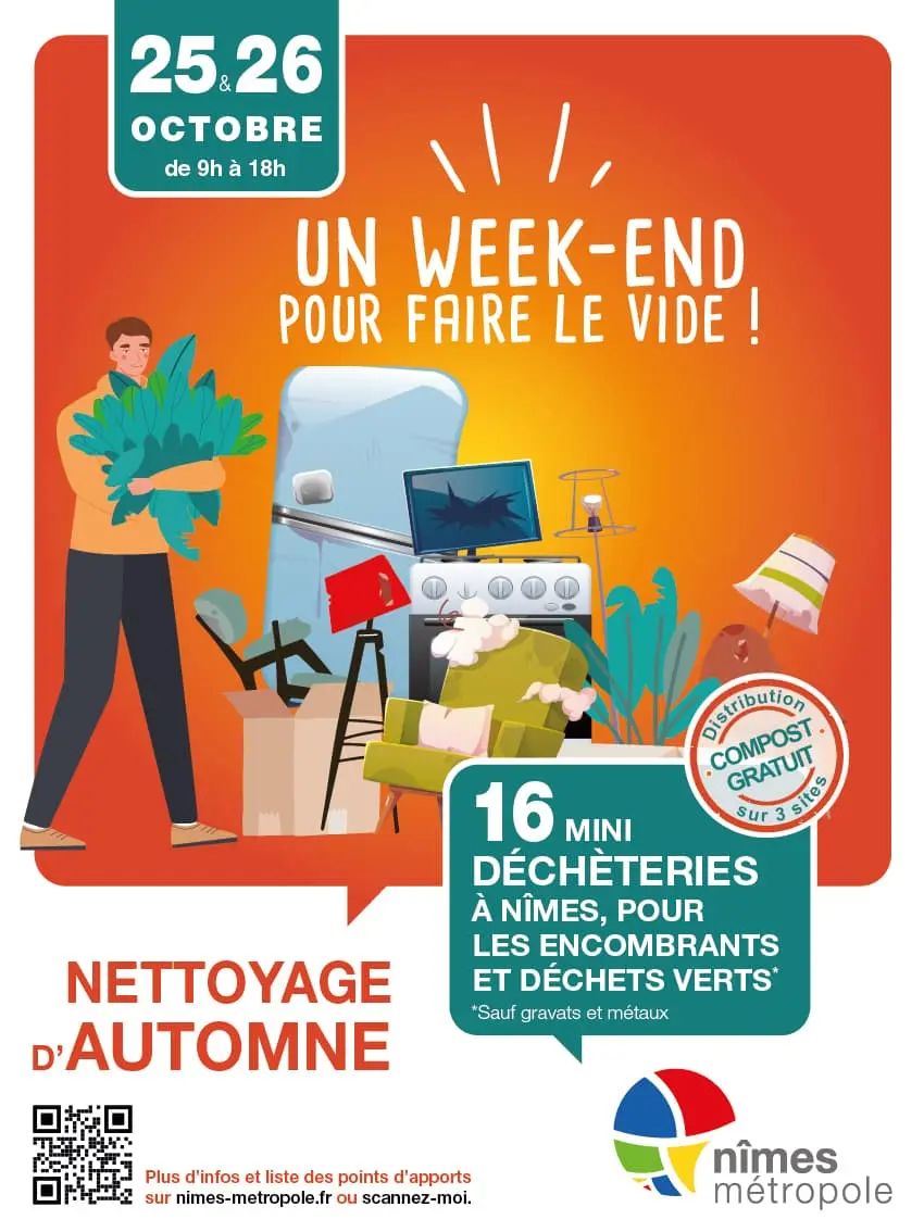 Le grand Nettoyage d’automne aura lieu les 25 et 26 octobre pour se débarrasser des encombrants et autres déchets verts. 16 mini-déchèteries de proximité s’installent au cœur des quartiers nîmois avec toujours en bonus la distribution gratuite de compost sur 3 sites !
