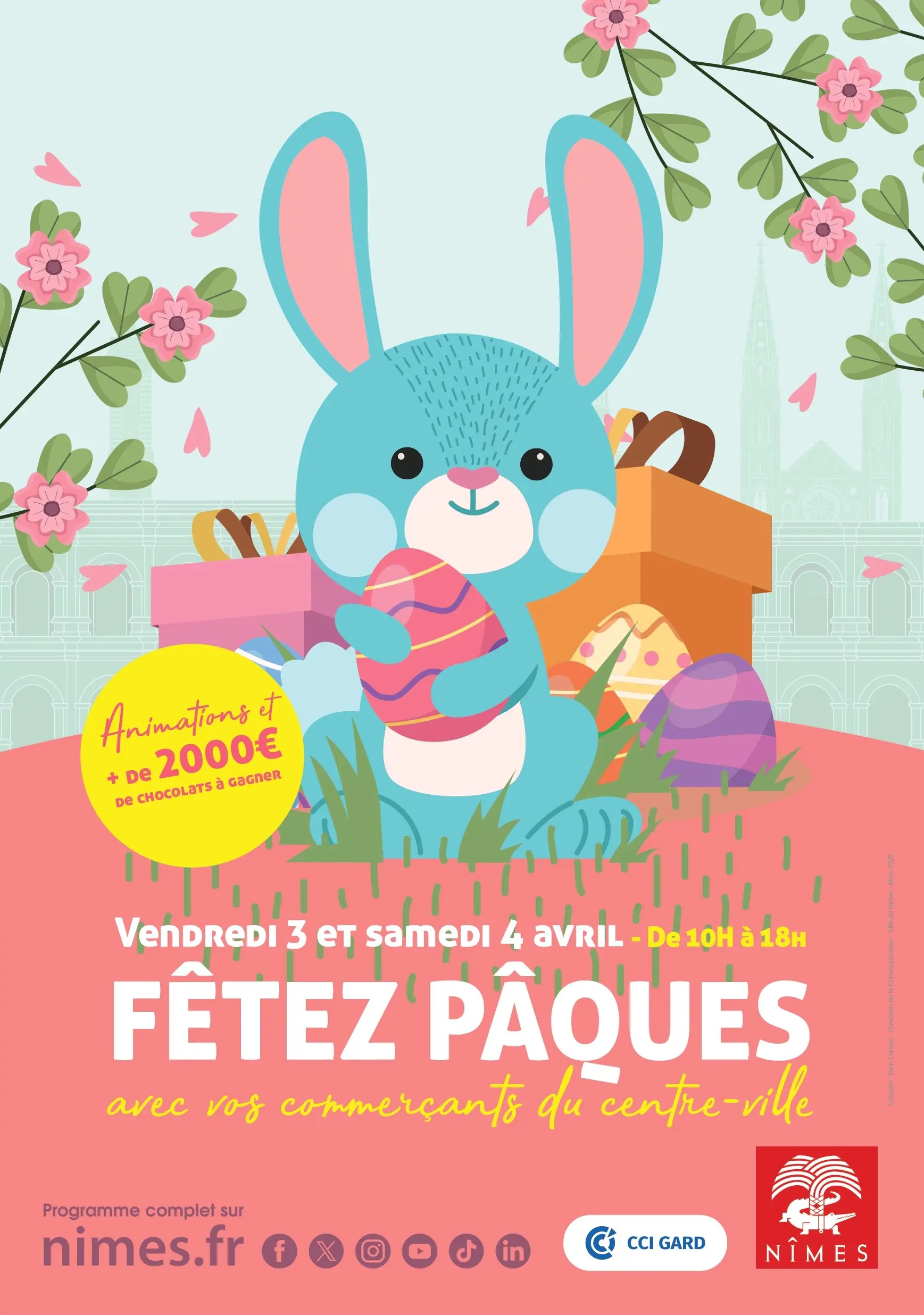 Cette année, près de 2000€ de chocolats tout droit sortis des ateliers et boutiques des chocolatiers/confiseurs nîmois sont à gagner dans les rues du centre-ville le vendredi 3 et samedi 4 avril. De quoi garnir généreusement son panier ! Une diffusion musicale est par ailleurs prévue.