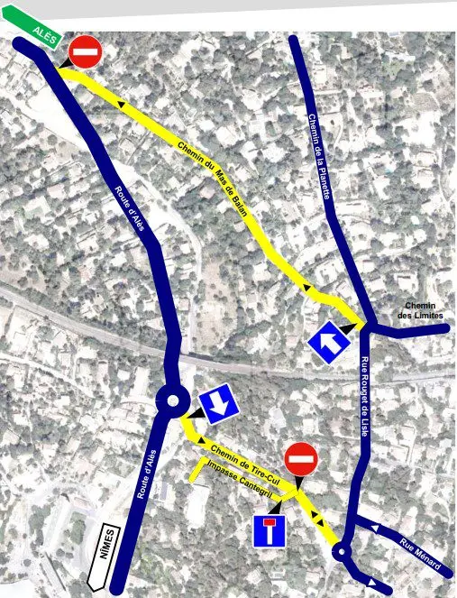 Le choix de ces sens de circulation s’est fait au regard des usages, s’agissant des sens préférentiels de circulation des deux chemins. Cela permet également de gérer les accès riverains et de sécuriser les mouvements au carrefour du chemin du Mas de Balan et de la route d’Alès. Le chemin de Tire-Cul est resté à double sens entre la place Paul-Valéry et l’impasse Cantegril pour faciliter la desserte riveraine.