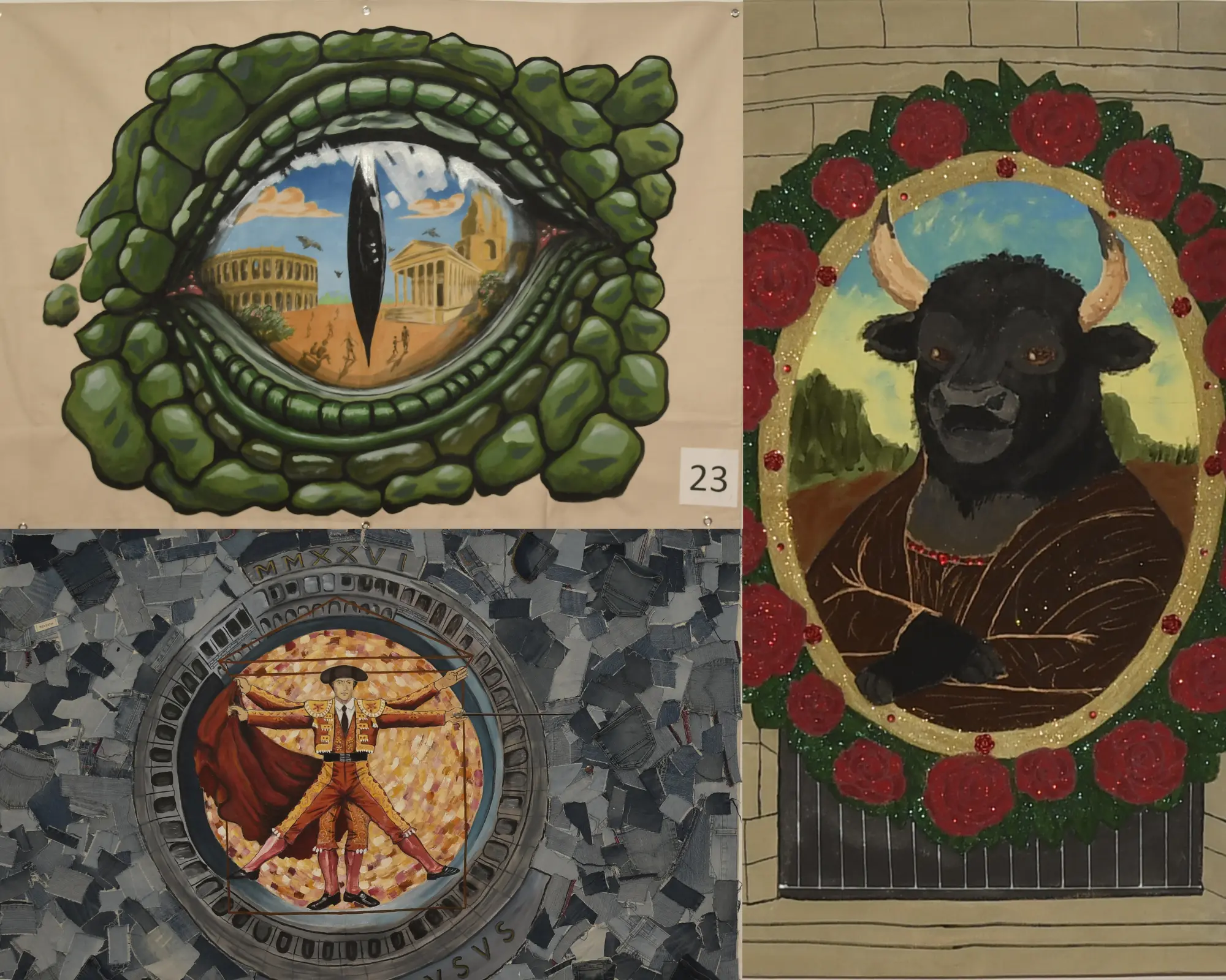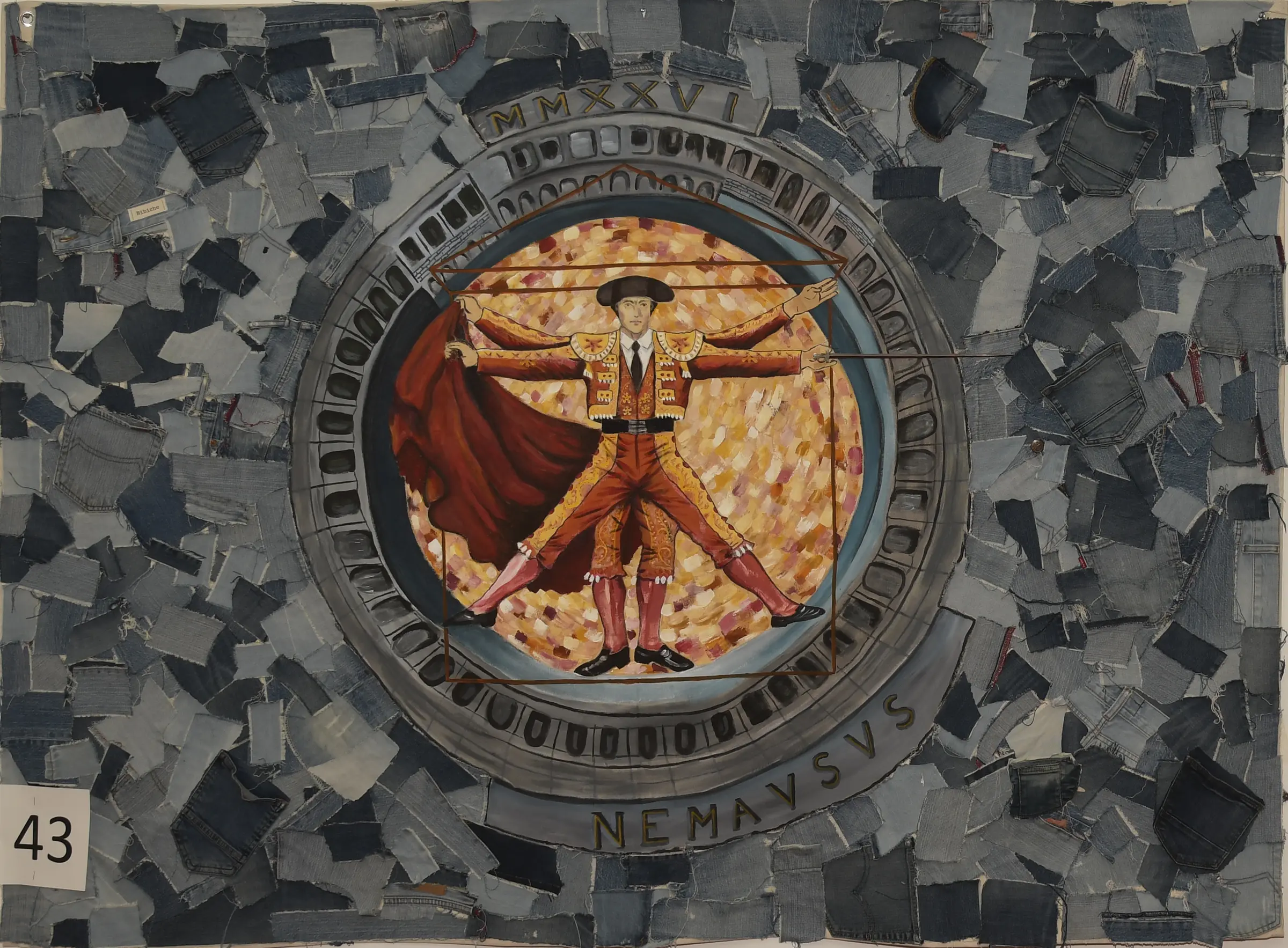 La toile n°43 remporte le “prix du jury”. Signée par Renaud Claudon, elle rend un clin d’œil audacieux à L’Homme de Vitruve de Léonard de Vinci, ici revisité de manière originale : la figure emblématique est remplacée par un torero.