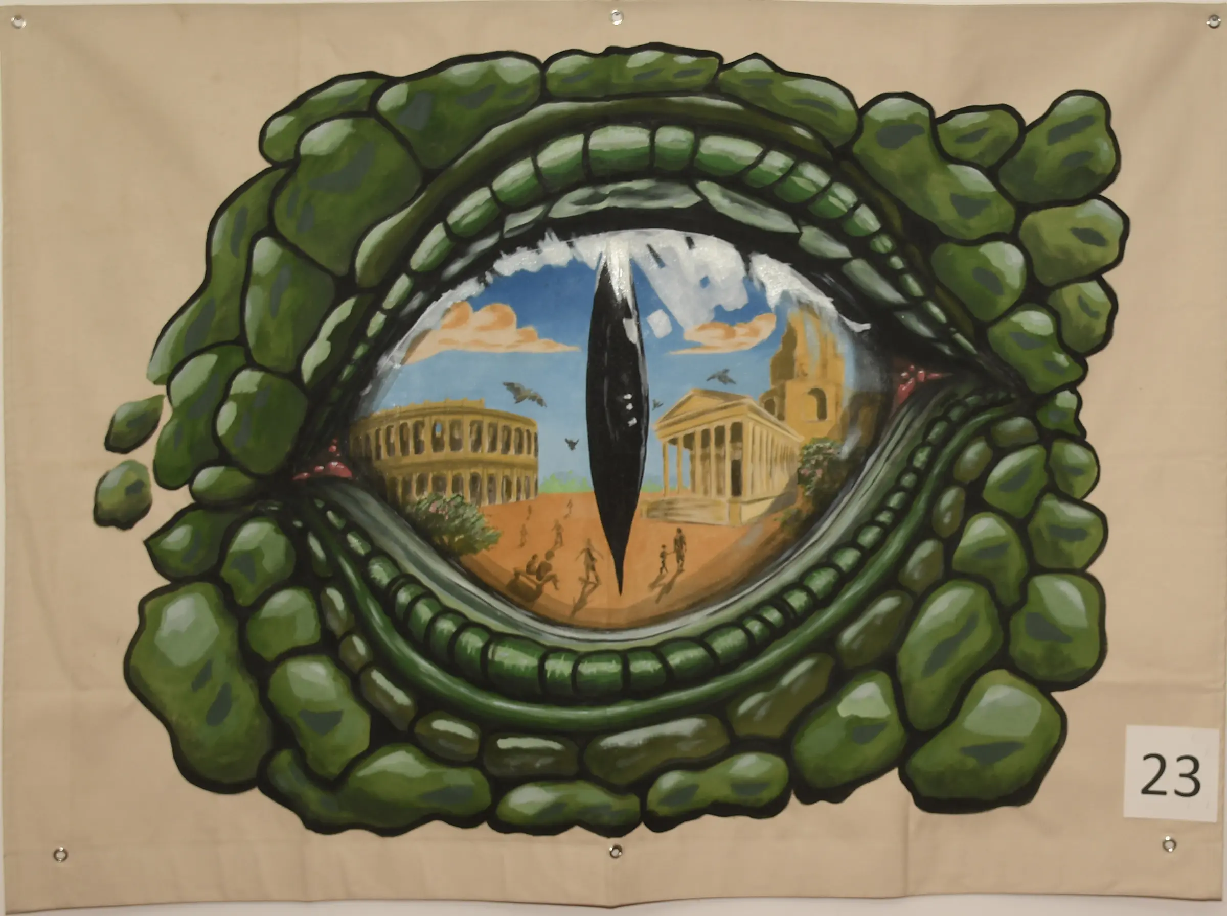 “Je suis ravi ! C’est ma première participation à Feri’art. Et cette année, les toiles étaient toutes magnifiques ! J’ai voulu me mettre à la place d’un crocodile qui contemple la ville, en mettant l’accent sur le regard, la vision des monuments, et on y voit discrètement une fille en train de faire du skate. Nîmes et le skateboard, c’est une longue histoire, presque une tradition !”
