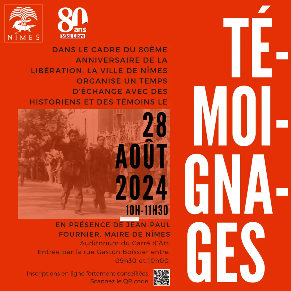 Dans le cadre du 80e anniversaire de la Libération de Nîmes, la Ville, en partenariat avec le journal Midi Libre, organise aussi un temps d’échange avec des historiens et des témoins de cette période, le 28 août de 10h à 11h30 à l’auditorium de Carré d’art. En présence de Daniel-Jean Valade, Conseiller délégué à l’enseignement culturel, et animé par Emilie Bec, cheffe d’agence de la rédaction Midi Libre à Nîmes, ce colloque grand public s’articulera autour de deux tables rondes, une sur l’Occupation et une sur la Libération, grâce à des historiens ou des témoins de cette période :