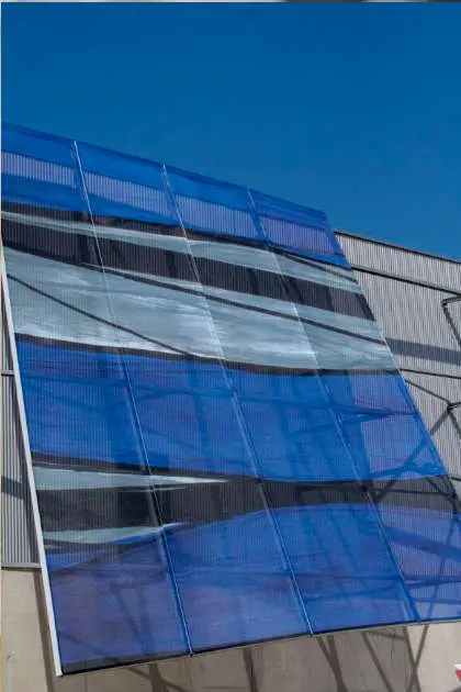 Composée de plusieurs volumes, la Halle des sports sera unifiée par cette façade dite « ruban » qui fait référence au passé textile de Nîmes, et au mouvement du ruban de la gymnaste. C’est l’artiste nîmois Alain Clément, proche du mouvement Supports/Surfaces, qui est ainsi à l’origine de cet habillage. « Cette intervention donne tout son sens à l’équipement. C’est une façade qui sera en perpétuel mouvement », assure Gilles Gal d’A+ Architecture en charge du projet. « Il fallait le symbole d’une grande voile tendue aux vents dans un seul mouvement emportant le bâtiment. Des tracés larges et dansant du bleu de Nîmes, des tracés noirs rapides, directs et tranchants, des fonds gris modulés pour unifier et faire palpiter l’ensemble », complète l’artiste Alain Clément.