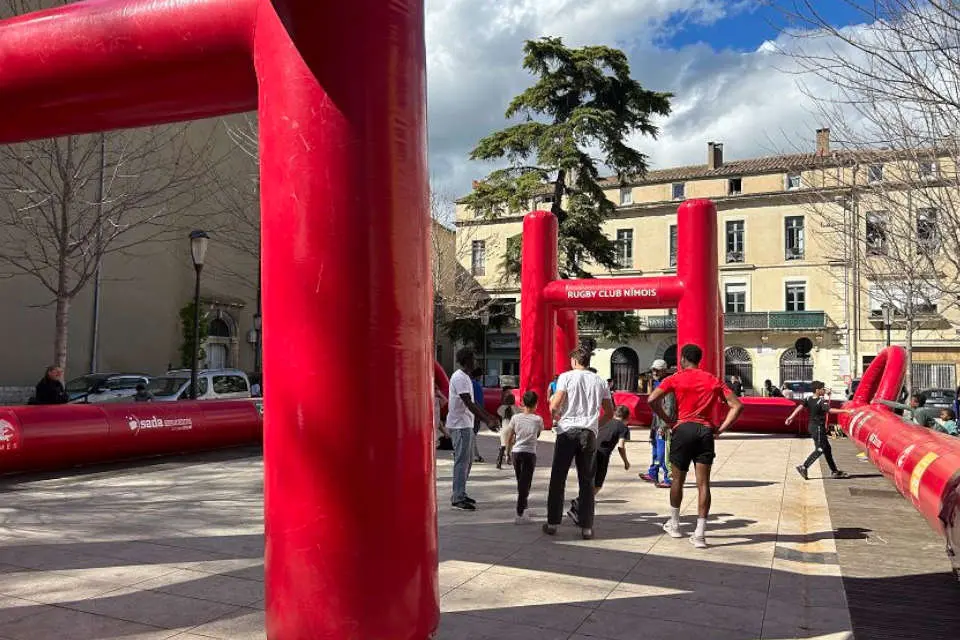 « Le Village rugby, c’est une structure gonflable qui vient se mettre en bas des bâtiments dans les quartiers prioritaires nîmois. D’une taille de 20 mètres par 10 mètres, elle a été imaginée et portée par le Rugby club nîmois (RCN) et permet aux jeunes de venir s’initier au rugby directement en bas de chez eux », explique Steeve Calligaro. Mercredi 3 avril, le président du RCN vient présenter son « Village Rugby » à la presse sur la place Saint-Charles, quartier Gambetta. Un dispositif déjà testé mi-mars à Valdegour.