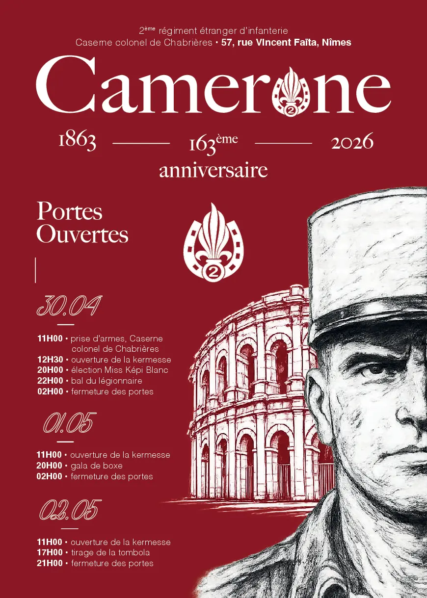 La caserne Colonel-de-Chabrières, au 57 rue Vincent-Faïta, ouvre ses portes au public le 30 avril, 1er et 2 mai, pour le 163e anniversaire commémorant le combat de Camerone. Un haut fait de la Légion étrangère célébré chaque 30 avril et honorant la pugnacité et le courage de 62 soldats de la Légion, assiégés dans une hacienda du petit village de Camarón de Tejeda, le 30 avril 1863. Les combattants résistèrent une journée entière face à l’assaut de 2 000 cavaliers mexicains.