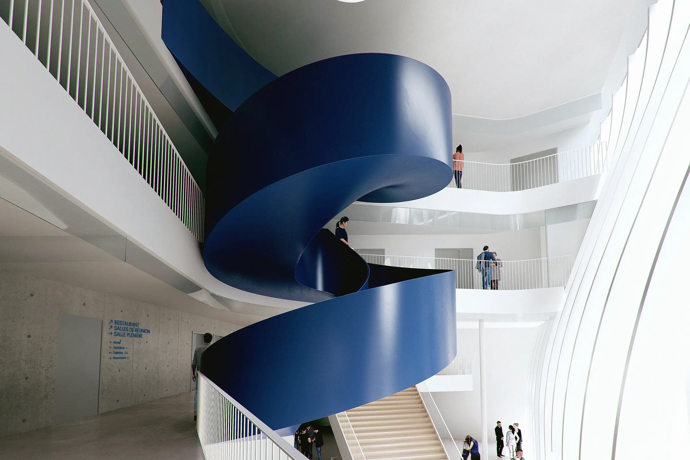 Les matériaux, les couleurs et le mobilier reflètent une atmosphère sobre, confortable et chaleureuse, grâce à une palette de matériaux nobles tels que la pierre, le béton brut et le bois. Ici, l’escalier monumental en spirale, d’un poids de 5 tonnes, intègre un élégant clin d’oeil au bleu "denim".
