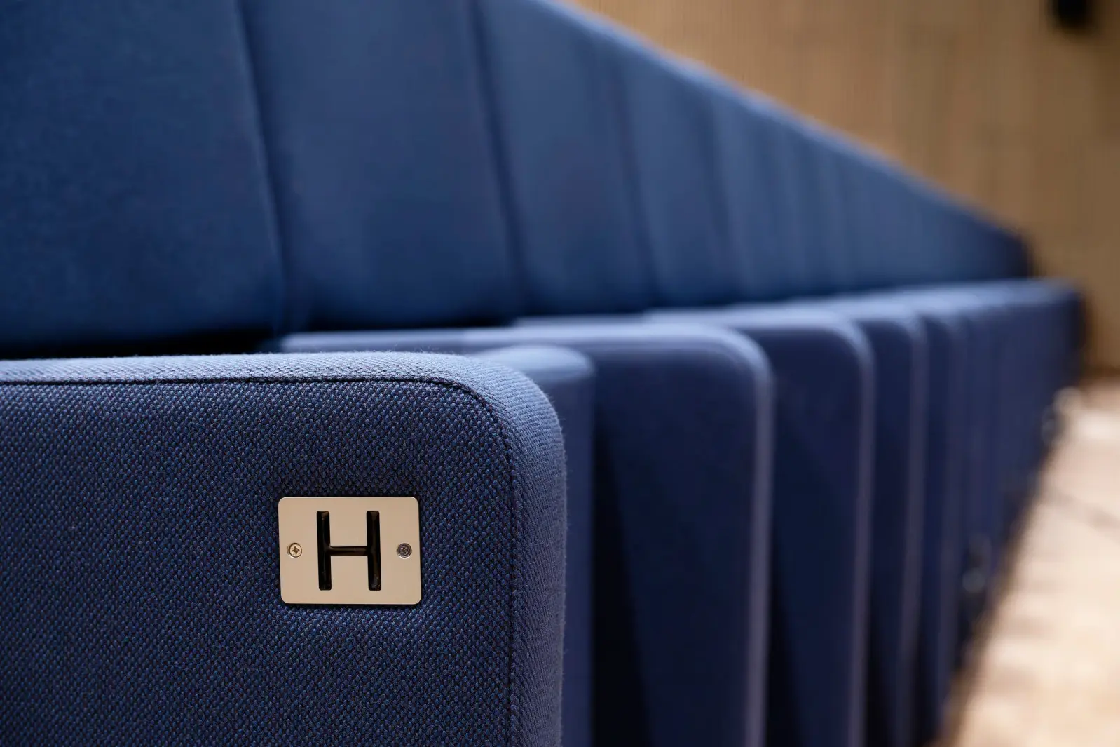 Sur cette photo, un détail des fauteuils de l’auditorium, revêtus d’un tissu aux couleurs de la toile de Nîmes, clin d’oeil à l’origine locale du denim, bien sûr.