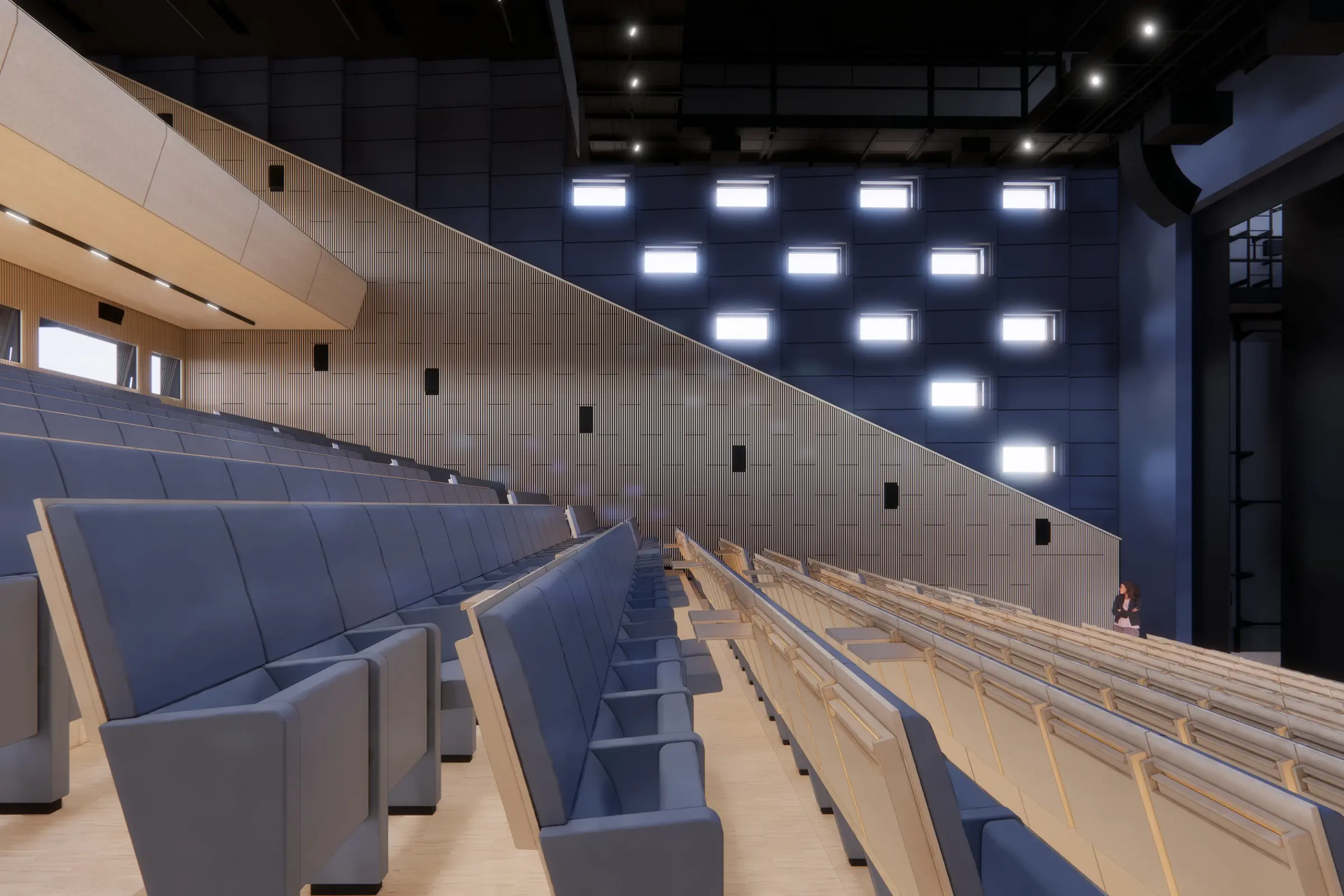 h2 déploie 8 500 m2 d’espaces flexibles. Pièce centrale du rez-de-chaussée, son auditorium de 672 places séduit par son design et ses performances. “Ses qualités techniques, sa scénographie, son ambiance chaleureuse font que c’est l’une des plus belles salles de France pour un centre des congrès”, souligne Lionel Devaux, architecte associé chez Chabanne Architecte et directeur de l’opération. Doté d’une scène de 200 m², l’auditorium est entièrement modulable et peut accueillir 300, 500 ou 672 spectateurs selon les configurations. Il dispose d’un système son AFC, technologie innovante recréant une acoustique naturelle pour une expérience d’écoute immersive. La salle bénéficie également d’un dispositif vidéo de pointe, avec un écran de 8 mètres sur 5.