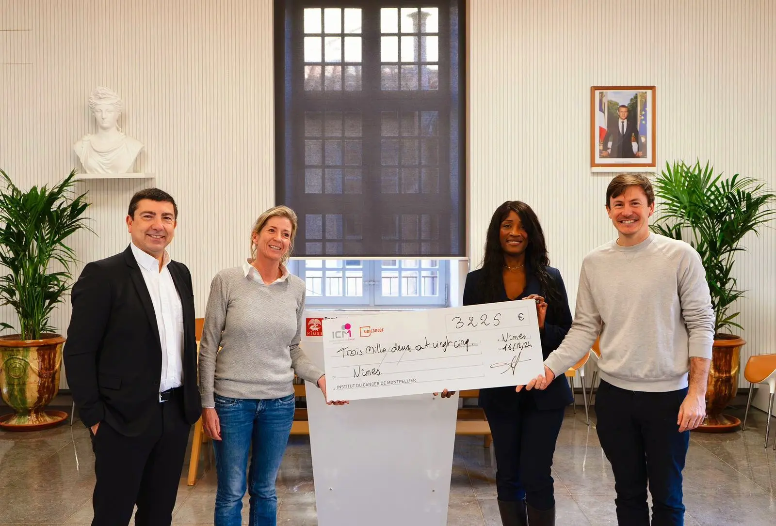 Lundi 16 décembre à l'Hôtel de Ville, Valentine Wolber, Adjointe déléguée aux commerces et Dolorès Orlay Moureau, adjointe déléguée à la santé, ont remis un chèque de 3 200 € aux représentants de l'institut de cancérologie de Montpellier (ICM), Yvannick Chataigné et Cédric Guillaumon, dans le cadre de l'action “Parapluies roses” mise en place pour la première fois cette année à Nimes. Cette action s'inscrit dans le cadre de la campagne de prevention contre le cancer Octobre rose. 50 commerçants du centre-ville de Nîmes ont permis de vendre plus de 200 parapluies.