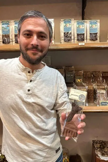 Dans le cadre des Journées du patrimoine (16 et 17 septembre), l’association Jemanimes et sa présidente, la plasticienne Guylaine Racheboom, sollicitent l’artisan chocolatier Charly Bascou pour réaliser des éléments de la Maison Carrée en chocolat. Baptisé le « Choco Carrée de Nîmes », cette création inédite en 3D met à l’honneur deux parties de l’édifice nîmois : le fronton réalisé en chocolat au lait 39%, et une colonne en chocolat noir 73% de Papouasie, bio et équitable. Prix de vente : 6€.