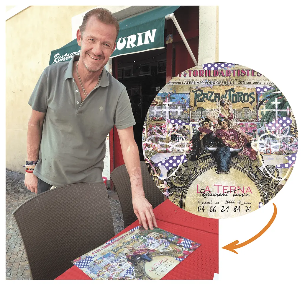Longtemps installé rue de la République, ce repère des aficionados vous ouvre désormais ses portes à l’angle de la Grand Rue et de la rue de la Poissonnerie. Vous ne situez pas ? Demandez aux passants « La rue du Blond », vous êtes sûr de trouver ! Car Manu, dit Le Blond, est une figure locale qui a su faire de son restaurant un lieu convivial, empreint du folklore espagnol et de la tauromachie. Les murs (et même le plafond) rendent hommage aux toreros qui ont créé l’histoire de la corrida nîmoise. On trouve partout des affiches de corridas, des photos taurines, des dédicaces de maestros ou des costumes de lumière, on peut même y voir les grandes corridas télévisées. La chaise sur laquelle Morante de la Puebla a entamé sa faena historique en mai 2010 trône dans la salle de restaurant, telle une relique consacrée. Côté assiette, les bons mangeurs seront rassasiés par la gardianne, la côte de taureau et ses frites maison, les tripes à la madrilène ou les escalopes milanaise et brochettes du grilladin, pour les moins audacieux. Artiste dans l’âme, le propriétaire expose aussi ses peintures d’inspiration taurine. Et même s’il en est fier (et il peut l’être), Manu préfère mettre en avant les œuvres de Julien Servy* de chez Toril d’artistes, dont les créations se retrouvent notamment sur les sets de table, que l’on prend grand soin de ne pas salir. Rendez-vous du 16 au 19 septembre pour la Feria des Vendanges, et toute l’année, pour de vrais moments de convivialité.